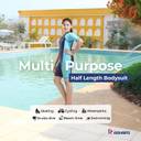 Owing to its minimalist design, this swimsuit combines practical features with understated style. Furthermore, the comfortable neckline and half sleeves offer a refined look that balances coverage and elegance. The zipper closure ensures easy wearing. Moreover, the short length adds a casual yet functional touch. The four-way stretch fabric allows free movement, making it ideal for physical activities in and out of the water. In addition, the soft texture of the fabric contributes to a comfortable wearing experience.