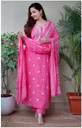 Boasting a fashionable embroidered pattern, this women’s kurta, palazzos, and dupatta set combines style and traditionalism. With a leheriya design and embroidery work on the yoke, it offers a vibrant and refreshing appearance to help you be the centre of attraction. So, whether you need to dress up for work or attend a family celebration, this set can accentuate your femininity.