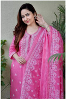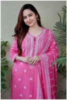 Flaunting a round neck with a short V-cut, the kurta in this set can give the ideal fit and shape to promote a sleek and polished impression. It features three-quarter sleeves for flexible movements and proper coverage to tone your arms, providing a smart and elegant look. Also, it offers pants for a body-hugging and A-line fit to help you flaunt your curves effortlessly. Furthermore, the floral embroidery on this dupatta can complement this set and add a graceful touch to the ensemble.