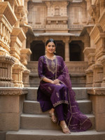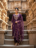 Thanks to its combination of embroidery and structured tailoring, this set can be worn for a range of festive occasions, parties, or weddings. Courtesy of the straight silhouette, calf-length kurta, and thoughtfully detailed dupatta, it pairs well with minimal jewellery for a casual yet polished look. Opting for natural makeup and a small bindi can add a traditional touch, completing a graceful and composed presentation.