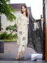 Sporting a V-neck and three-quarter sleeves, this set is styled in a straight silhouette with a calf-length cut. The V-neck adds a refined touch that frames the neckline gracefully, while the sleeve length offers both comfort and a composed appearance. The straight structure lends itself to a neat fall, complementing the overall length of the kurta. The calf-length design enhances this outfit’s presence, ensuring it carries a balanced and graceful flow when worn with the matching trousers and dupatta.