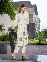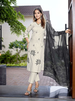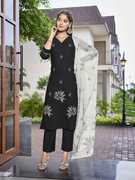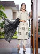 Featuring a floral embroidered kurta, a printed dupatta, and solid pants, this women’s kurta, pant, and dupatta set showcases a thoughtful balance of textures and motifs. The embroidery on the kurta highlights traditional craftwork, while the printed dupatta brings a touch of vibrancy with its detailed surface design. The solid pants complete the trio with simplicity, allowing the embroidery and print to remain the centre of attention.