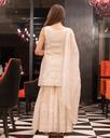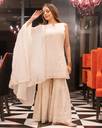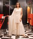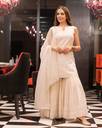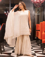 Featuring an intricate chikankari embroidery, this women’s kurta, shararas, and dupatta set reflects high-quality craftsmanship. The V-neck kurta adds a touch of class, making it suitable for weddings, parties, and festive occasions. And, with its detailed embroidery, the wide-legged shararas enhance the overall beauty and provide a graceful flow. Also, the matching dupatta adds another layer of elegance to this set.