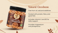 Thanks to their natural composition, these almonds are free from oil and salt, offering a clean snacking option. They contain essential nutrients, including protein, fibre, and healthy fats, which contribute to daily nutritional needs. Furthermore, with the presence of vitamins E and B2, along with minerals, like magnesium and phosphorus, they support general well-being. These almonds also do not include any added preservatives, making them a straightforward choice for those seeking simple and nutrient-rich ingredients in their diet.