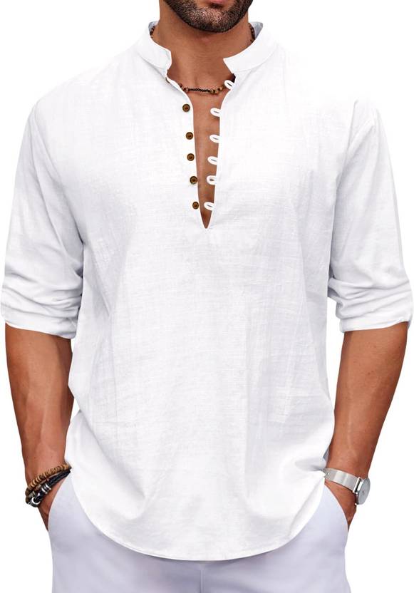 Make a bold yet refined style statement with this men’s casual shirt featuring a split neckline and wooden button placket. Crafted from a soft, breathable fabric, this shirt is tailored for comfort and casual sophistication. The split neck combined with a Mandarin-style collar and detailed buttoning gives the shirt a contemporary ethnic flair, ideal for everyday wear, holidays, beach outings, or relaxed evening gatherings. Full-length sleeves can be easily rolled up for a laid-back appeal. Its minimal yet distinctive design ensures you stand out while staying comfortable and stylish throughout the day. Easy to pair with both ethnic and western bottoms, this shirt is a versatile must-have.