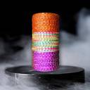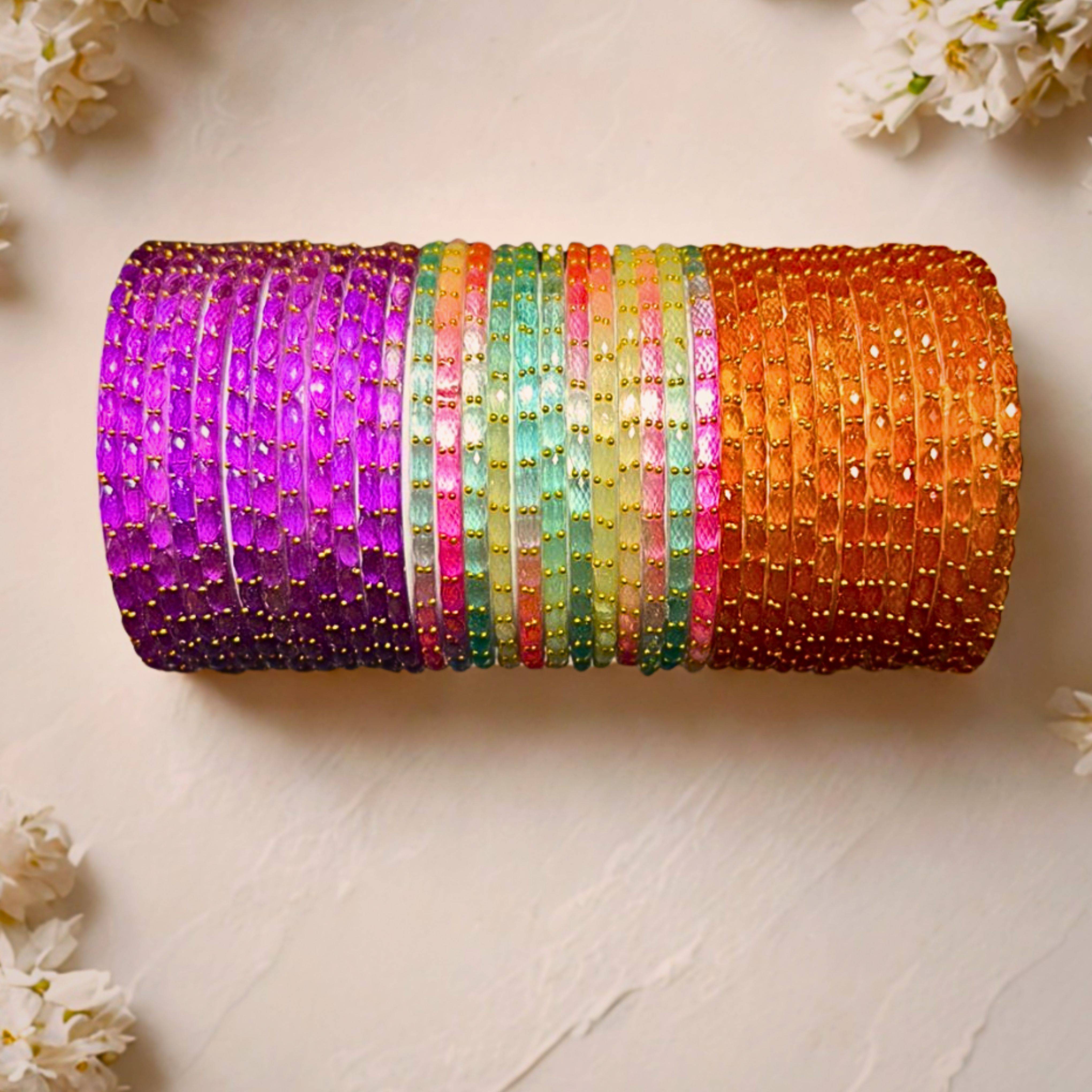 This is a set of vibrant multicolor bangles, typically worn by women and girls as traditional jewelry in South cultures. The bangles are made of glass, featuring bright neon colors such as yellow, pink, blue, green, and orange, each adorned with tiny golden beads or glitter detailing for extra sparkle. The bangles are stacked together in a cylindrical arrangement, ideal for festive occasions, weddings, or everyday ethnic wear.