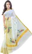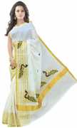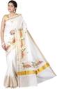 RSV FABRICS Animal Print Kasavu Cotton Blend Saree (White)