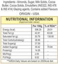 ALMONDS,SUGAR, COCOA BUTTER, COCOA SOLIDS ,CONTAINS ADDED FLAVOURS AND etc.
