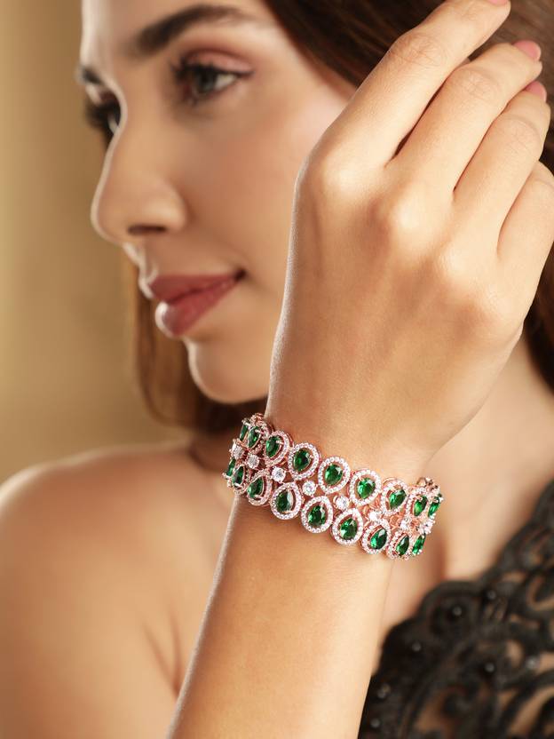 This 22K rose gold-plated bracelet showcases pear-cut emerald green stones and sparkling cubic zirconia accents in a luxe openable design for statement festive elegance.