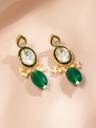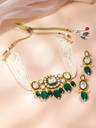 This stunning 22K gold-plated jewellery set features white kundan stones, emerald green beads, and layered pearl strands—ideal for women to wear on festive, wedding, party, or any special occasion.