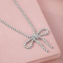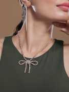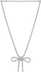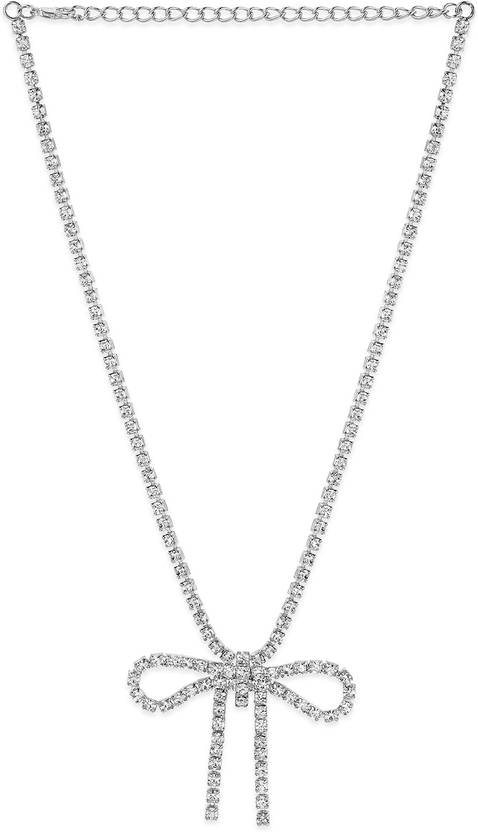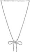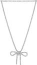 This elegant rhodium-plated necklace features a sparkling bow-shaped pendant encrusted with cubic zirconia stones. Its delicate design and shimmering details make it a perfect accessory for adding a touch of feminine charm to both casual and formal outfits.