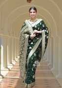 Soft silk-blend Banarasi saree with heavy zari border, lightweight yet festive look.