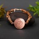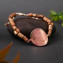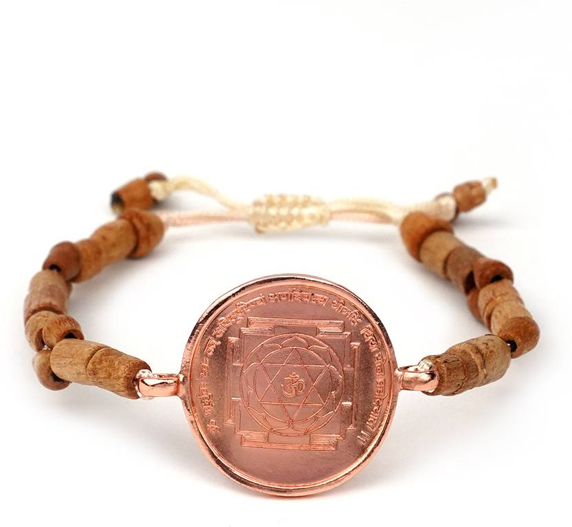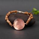 The Shree Gayatri Yantra Bracelet in Copper has the Yantra perfectly and neatly embossed on a round Copper coin which is slightly bent to fit the wrist. The Bracelet is strung in an adjustable thread with wooden beads of cylindrical and round shapes that make this Bracelet more appealing.