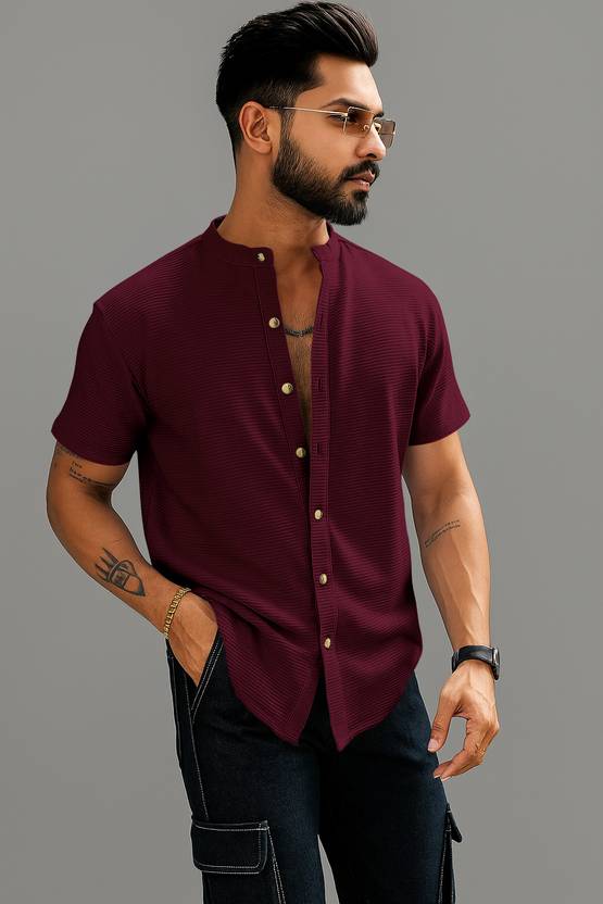 Men Regular Fit Solid Mandarin Collar Casual Shirt