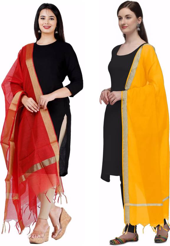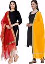 A combo of solid red and yellow dupattas with a zari border and tussles. Can be paired with any outfit and are perfect for any occasion. This combo of dupattas is a perfect addition to your wardrobe. Be it workplace or party hall these dupattas will make you stand out among your peers by adding an extra layer of style to your outfit