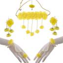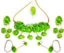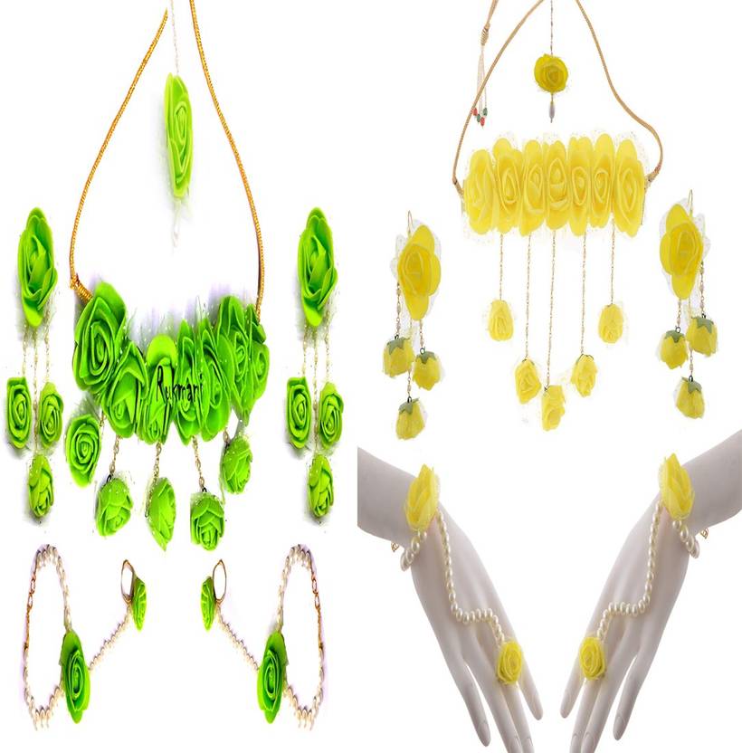 1Nacklace, 1Mang Tika, 1 pair Earrings, 1 pair Hath Phool complete 2 Set of Green and Yellow, A Set of Green And A Set of Yellow