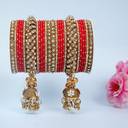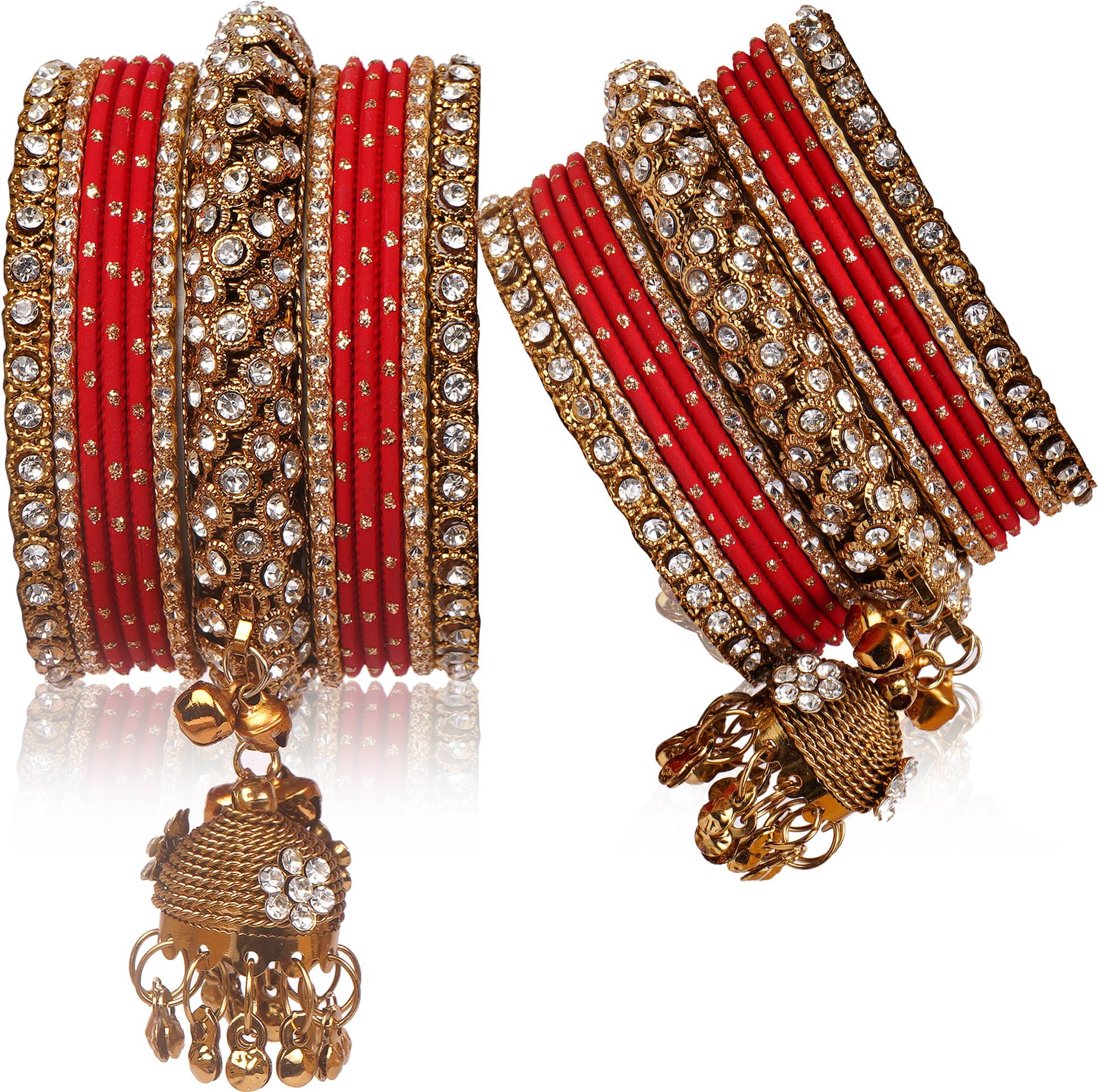 Elevate your bridal look with this exquisite set of Indian wedding bangles. Crafted with intricate details, these lightweight bangles feature a stunning combination of golden tones and sparkling crystals. The ornate design showcases a series of intricately embellished bands adorned with shimmering stones, creating a glamorous and opulent aesthetic. Finished with delicate dangling charms in the shape of traditional Indian motifs, these bangles are the perfect accessory to complement your bridal ensemble. Whether you're the bride or a bridesmaid, these bangles will add a touch of elegance and cultural significance to your special day. Embrace the timeless beauty of Indian craftsmanship with this captivating bangle set.