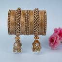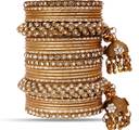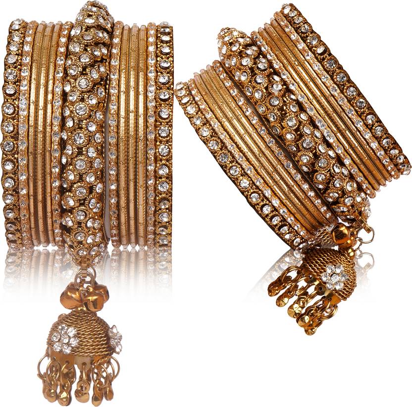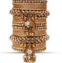 Elevate your bridal look with this exquisite set of Indian wedding bangles. Crafted with intricate details, these lightweight bangles feature a stunning combination of golden tones and sparkling crystals. The ornate design showcases a series of intricately embellished bands adorned with shimmering stones, creating a glamorous and opulent aesthetic. Finished with delicate dangling charms in the shape of traditional Indian motifs, these bangles are the perfect accessory to complement your bridal ensemble. Whether you're the bride or a bridesmaid, these bangles will add a touch of elegance and cultural significance to your special day. Embrace the timeless beauty of Indian craftsmanship with this captivating bangle set.