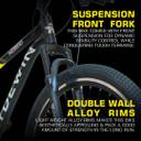 Featuring a suspension front fork, this mountain cycle ensures dynamic stability control while handling rough trails or uneven paths. The double-wall alloy rims add strength while maintaining a lightweight feel, making them suitable for extended use. Moreover, the frame is crafted from sturdy mild steel, offering a solid base for everyday riding. A plastic mudguard is included to help protect from splashes during off-road adventures.