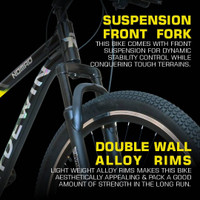 Sporting a hi-tensile steel frame, this cycle provides lasting durability, even under regular and demanding use. Both front and rear disc brakes contribute to responsive stopping power. The combination of a suspension fork and double wall alloy rims offers a well-balanced ride, absorbing shocks and helping the rider stay in control across different terrains.