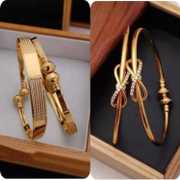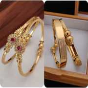 The image displays two distinct styles of gold-toned bangles. On the left, a pair of bangles features an intricate floral design with central red gemstones surrounded by smaller, clear stones, set against an ornate gold filigree pattern. The bangles themselves have a textured, ridged finish. On the right, a single bangle showcases a more modern, open-ended design with intertwined loops, accented with sparkling clear stones, suggesting an infinity symbol or a stylish knot. Both pieces appear to be crafted with attention to detail, highlighting different aesthetic preferences in jewelry.