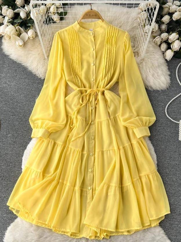 S P STOUR Women Fit and Flare Yellow Midi/Calf Length Dress