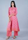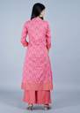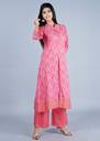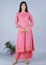 Pink, maroon and golden Foil Print Front Slit kurta with palazzos. Pink, maroon and golden Foil Print Front Slit A-line calf length kurta, has a mandarin collar, three-quarter sleeves, flared hem, front slit. Maroon and golden Foil Print chevron pattern palazzos, has elasticated waistband.