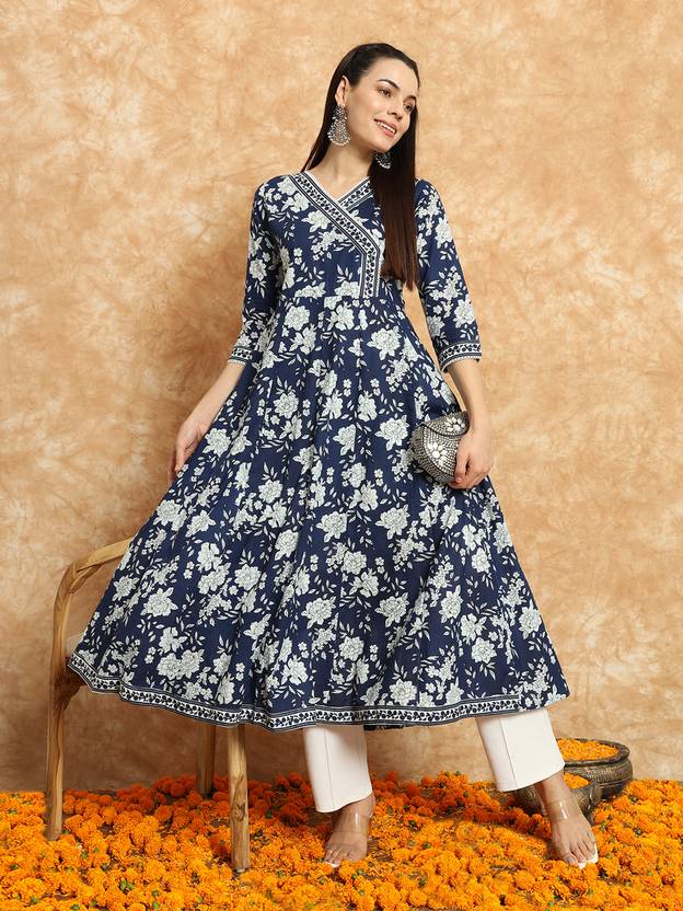 Women Printed Cotton Rayon Anarkali Kurta (Blue)