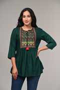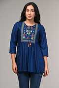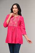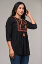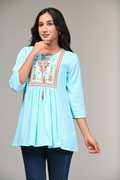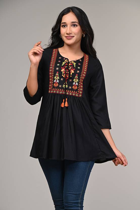 Embrace a blend of comfort and style with this Bohemian Embroidered Rayon Tunic Top. Crafted from soft, breathable rayon fabric, this top features a relaxed fit that flatters any silhouette. Featuring exquisite multicolor embroidery on the yoke, this kurti combines traditional craftsmanship with modern design. The front tassel tie adds a charming touch, while the relaxed fit ensures comfort throughout the day. Perfect for casual outings or festive occasions, this versatile piece pairs beautifully with jeans, leggings, or palazzos.