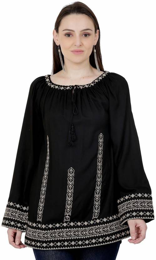 SAAKAA Casual 3/4 Sleeve Embroidered Women Black Top