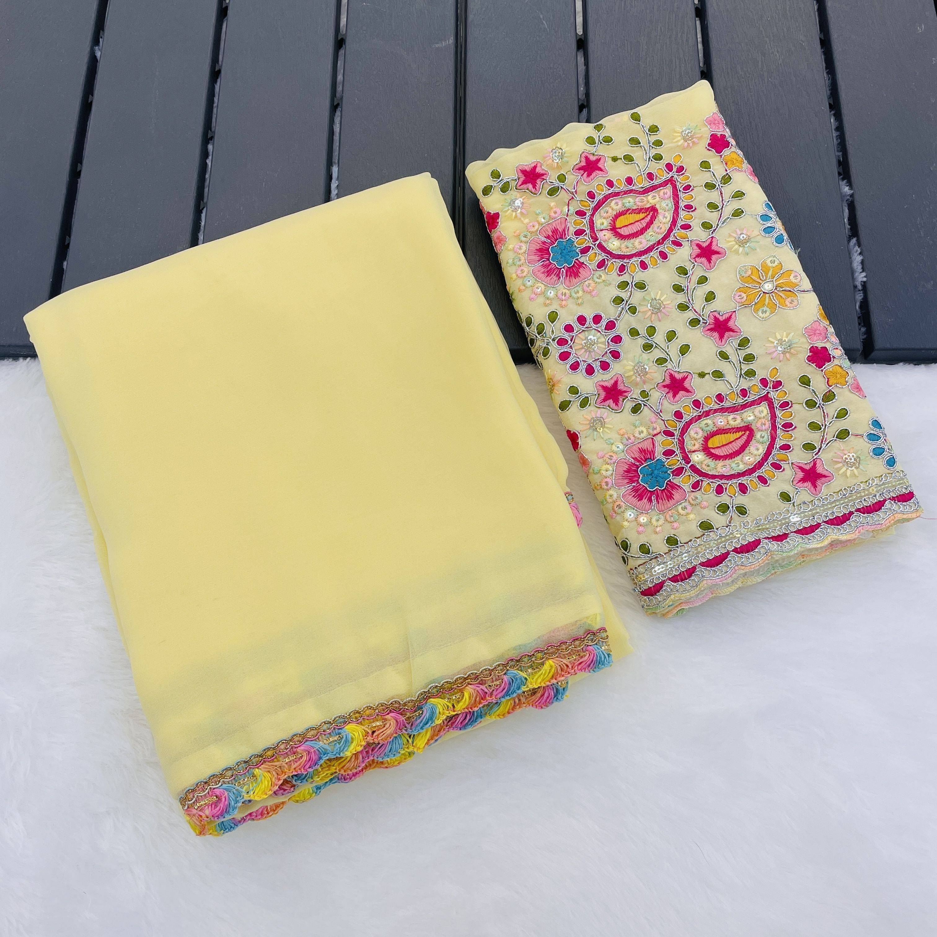 Elevate your ethnic wardrobe with this stunning Georgette Saree. Designed for the modern woman, this saree features a solid, flowy body that drapes beautifully, highlighted by a delicate multi-color lace border. The showstopper of this ensemble is the Heavy Designer Blouse Piece, featuring intricate floral and paisley embroidery in vibrant shades
