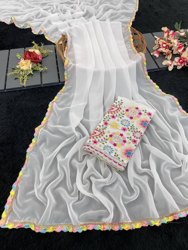 Elevate your ethnic wardrobe with this stunning Georgette Saree. Designed for the modern woman, this saree features a solid, flowy body that drapes beautifully, highlighted by a delicate multi-color lace border. The showstopper of this ensemble is the Heavy Designer Blouse Piece, featuring intricate floral and paisley embroidery in vibrant shades