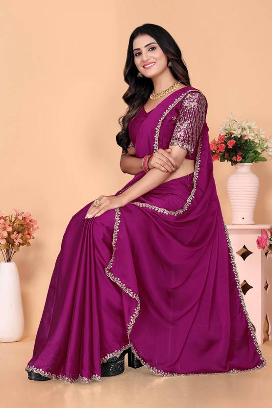 saanvi Solid/Plain, Embroidered Bollywood Silk Blend Saree (Purple)