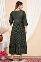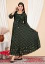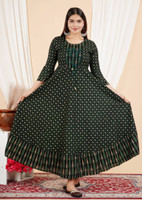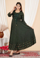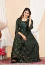 Sporting three-quarter sleeves, this gown provides a balanced blend of coverage and comfort. The design allows for easy movement while maintaining a stylish appearance. The round neck contributes to a classic silhouette, and the flared A-line cut creates a graceful flow that enhances the overall look. This design ensures this gown is flattering and easy to wear for any casual event.