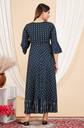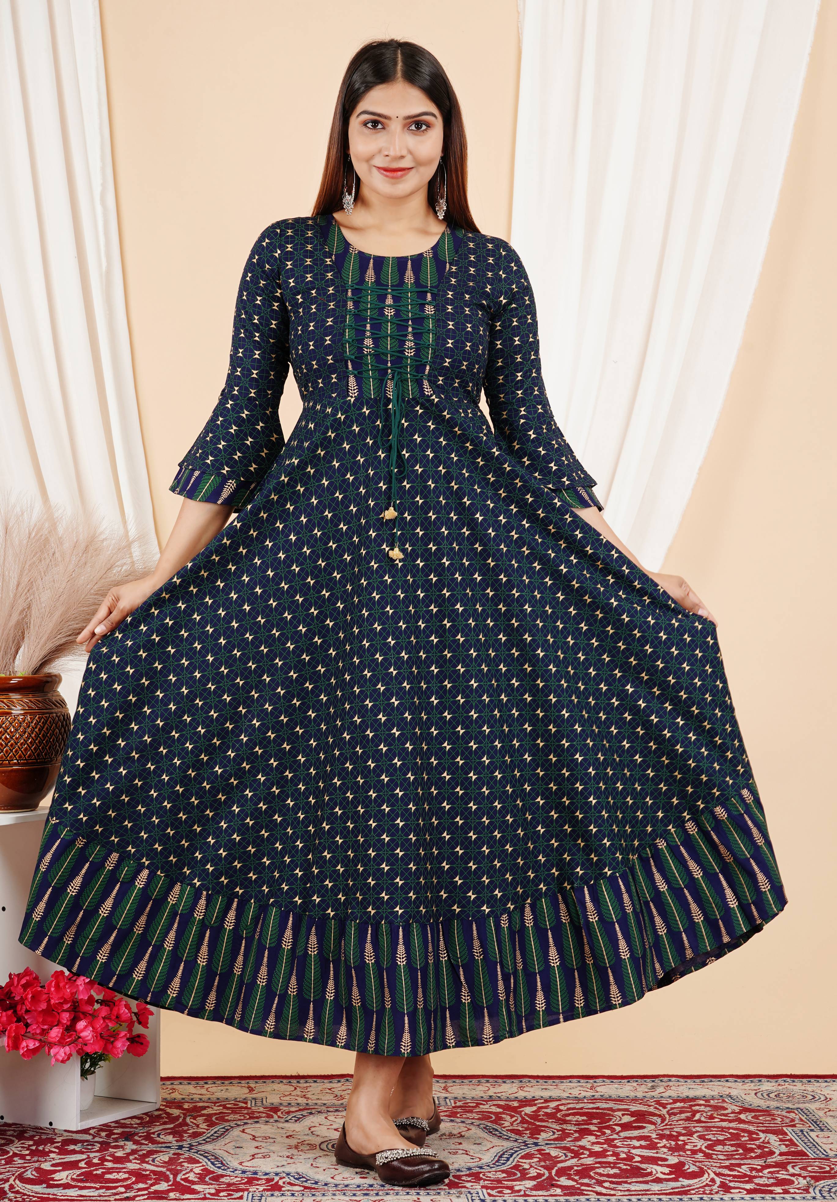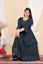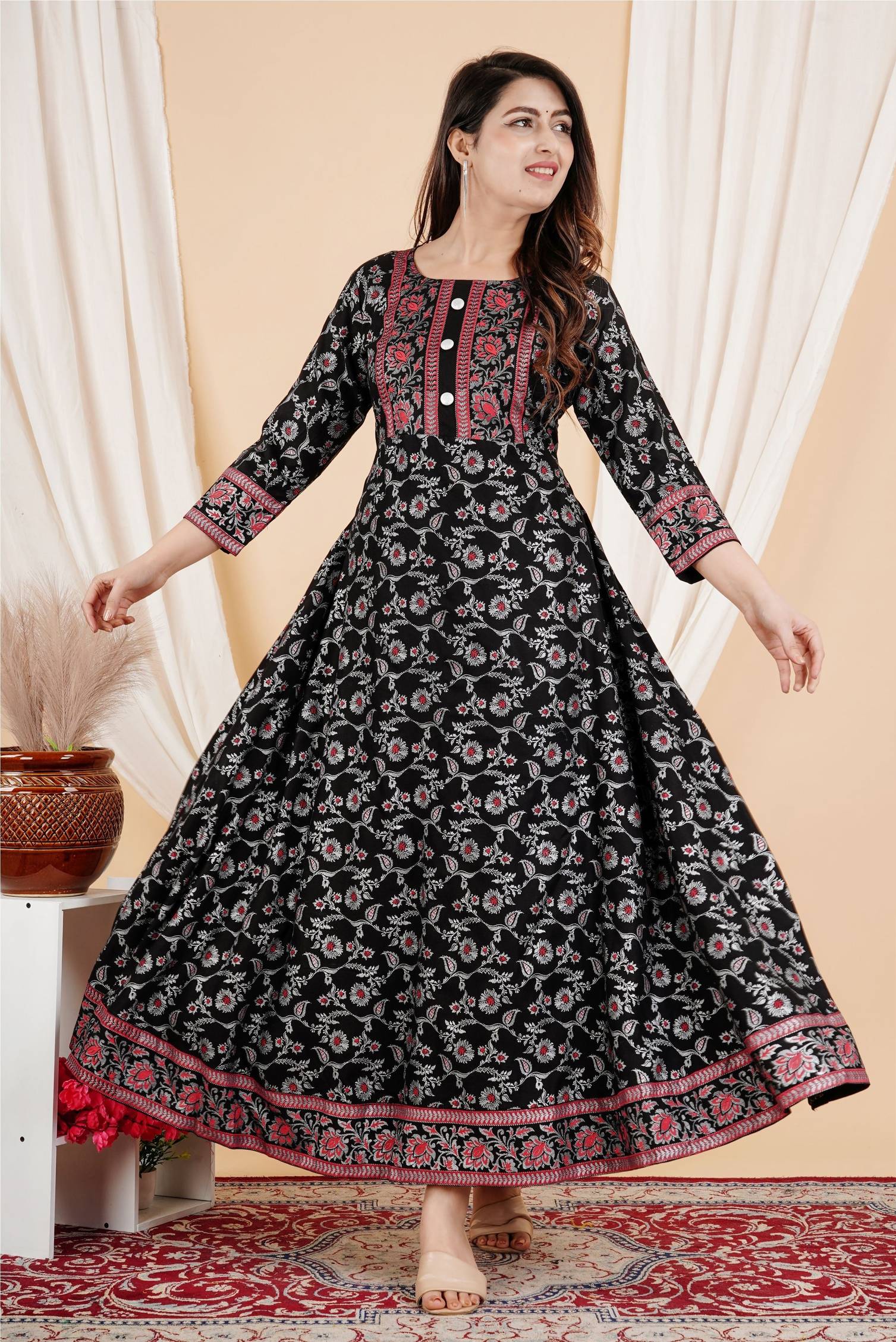 Sporting a round neck, this gown provides a timeless and flattering neckline that complements various body shapes. The three-quarter sleeves extend to just below the elbows, offering a comfortable fit and adding a refined touch. The full-length design flows elegantly to the floor, creating a dramatic silhouette. The flared cut adds movement and grace, ensuring this gown moves beautifully with every step.