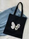 Thanks to its striking graphic print, this women's tote bag showcases a large butterfly adorned with patterned details on its wings. The butterfly is positioned beside a cluster of daisies and small blooms, creating a balanced and eye-catching look. Furthermore, the striking print stands out against the monochrome background.