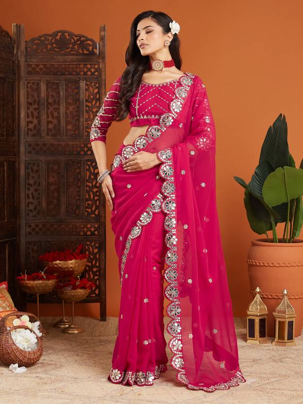 Embroidered Georgette Saree with Mirror & Sequin Work and Scallop Cutwork Border