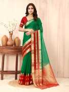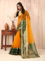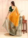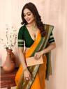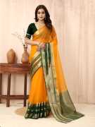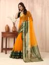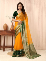 sadika Printed Bollywood Organza, Cotton Linen Saree (Yellow, Dark Green)
