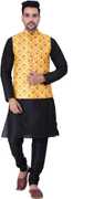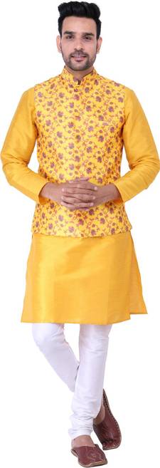A kurta pajama paired with a Nehru jacket is a classic and stylish ensemble that blends traditional Indian attire with a touch of modern elegance. The kurta is a long, loose-fitting tunic that typically reaches below the knees. It is made from Dupuion SIlk Kurta Pajama and Satin Fabric used in Nehru Jackat. The pajama, also known as pyjama or churidar, is the bottom part of the attire. It is usually straight-cut and loose-fitting, providing comfort and ease of movement. Named after Jawaharlal Nehru, India's first Prime Minister, the Nehru jacket is a sleeveless, hip-length jacket. It is typically tailored with a mandarin collar that stands up straight, distinguishing it from Western-style jackets.Together, the kurta pajama with a Nehru jacket creates a polished and sophisticated appearance suitable for formal occasions such as weddings, festivals, or cultural events.
