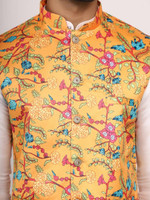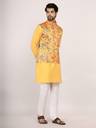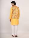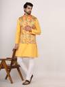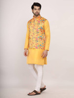 Featuring a stylish floral print pattern, this men's kurta, pyjama and jacket set adds a touch of sophistication to traditional wear. The floral design is subtle yet eye-catching, offering a distinct aesthetic that stands out. The pattern enhances the overall appeal of this set, making it an ideal choice for a range of occasions. The intricate detailing reflects a sense of artistry, which complements the elegance of the garment.