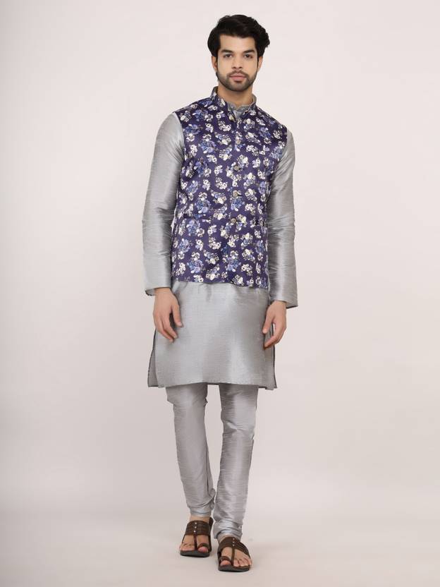 Men Silk Blend Kurta Pyjama Ethnic Jacket Set