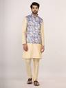 Redefine tradition with a modern twist. This set pairs the timeless comfort of a silk-blend kurta pajama with a vibrant, printed Nehru jacket for a look that is both sharp and spirited. The blend of fibers offers a premium sheen without the weight, keeping you cool and crease-free from the morning ceremony to the late-night dinner. Whether it's a garden party or a festive brunch, the intricate print on the waistcoat adds a layer of curated style to your wardrobe.