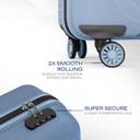 8 wheels, 360 degree Smooth Wheeling System, Combination Lock, Push Button Multi-Stage Trolley, Sturdy Zipper, Sturdy Handle, Polyester Lining, 3 Years International Warranty, Light weight, Polypropylene construction, scratch resistant, impact resistant, water resistant, Spacious