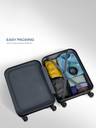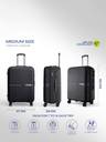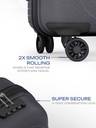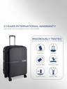 8 wheels, 360 degree Smooth Wheeling System, Combination Lock, Push Button Multi-Stage Trolley, Sturdy Zipper, Sturdy Handle, Polyester Lining, 3 Years International Warranty, Light weight, Polypropylene construction, scratch resistant, impact resistant, water resistant, Spacious