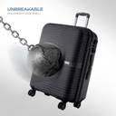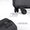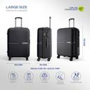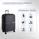 8 wheels, 360 degree Smooth Wheeling System, Combination Lock, Push Button Multi-Stage Trolley, Sturdy Zipper, Sturdy Handle, Polyester Lining, 3 Years International Warranty, Light weight, Polypropylene construction, scratch resistant, impact resistant, water resistant, Spacious