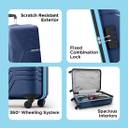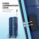 Fixed combination Lock, Scratch Resistant, Light weight, 4 wheels, Push Button Multi-Stage Trolley, Twin Side Packing, Zipper, Retractable Handle, Polyester Lining, 3 Year International Warranty, Polypropylene shell,