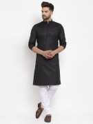 The kurta features a straight fit that creates a sharp, structured silhouette, complemented by a mandarin collar and a clean buttoned placket that reflect timeless craftsmanship with contemporary design sensibilities. Its knee-length profile with full sleeves blends tradition with modern style, while the matching pyjama is designed for ease of movement and a relaxed yet polished look, completing the ensemble with effortless sophistication.