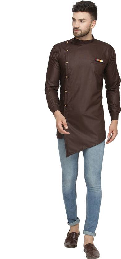 SAIFOO Men Solid Asymmetric Kurta (Brown)