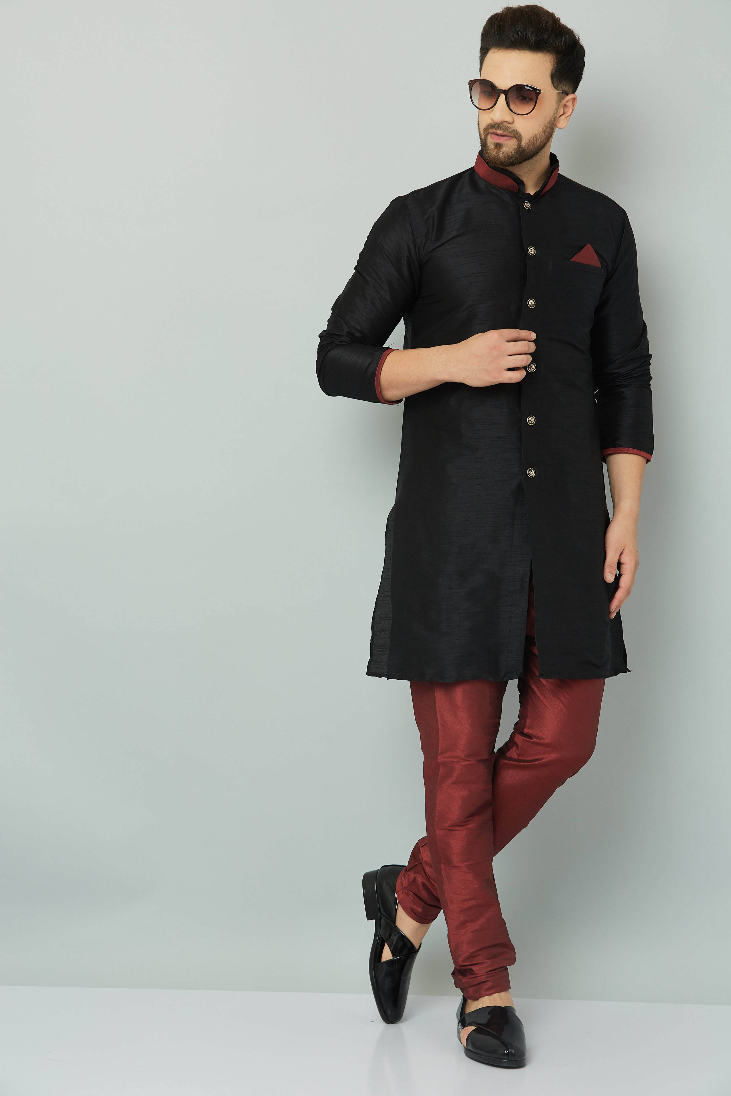 KAIFOO, We take pride in our commitment to maintain quality standards in each piece manufactured by us. A true epitome of class, long kurta will surely reflect your impeccable taste in fashion. Made from banarsi dupion silk fabric, this set will surely make you the cynosure of all eyes. Team this jacket with a pair of mojris or kolhapuri chappals to give a classy touch to your ethnic look.