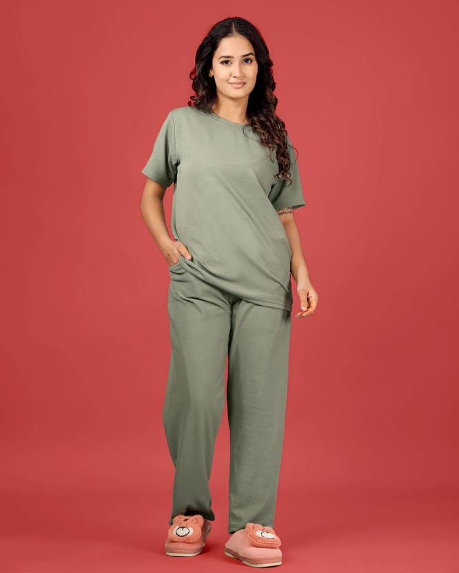 SAKARMAA Women Top & Pyjama Set Light Green Solid